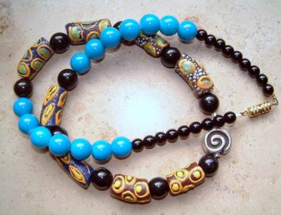 bunte Perlenketten aus Glas, zusammengestellt aus meiner aufgelösten Perlensammlung, die mir über viele Jahre eine geliebte Leidenschaft war und dann mit selbstgeblasenen Stücken am Gebläsebrenner wieder aufgefüllt wurde: gedreht, gewickelt und in Muster geformt.