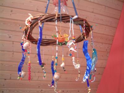 Einige Kränze mit angehängtem farbigen Glaswerk, Trödel und Perlenschmuck: sonderbar, ausgefallen, dominierend, nicht alltäglich. Etwas wie aus einem Harry-Potter-Film.