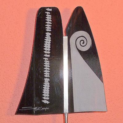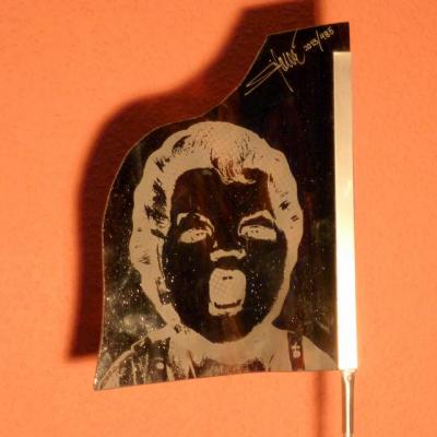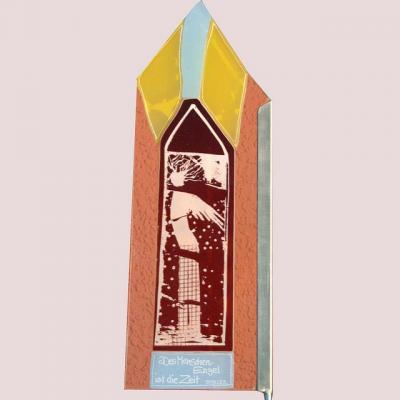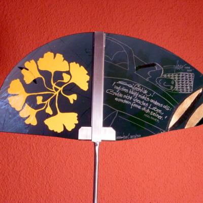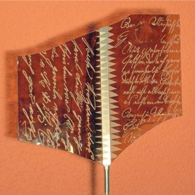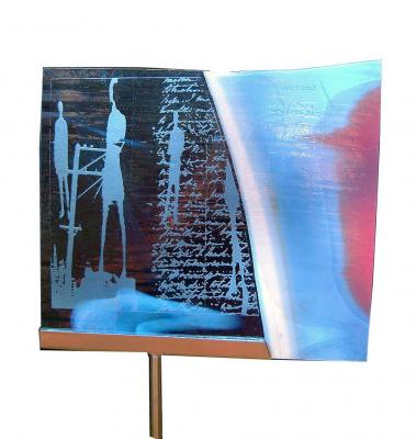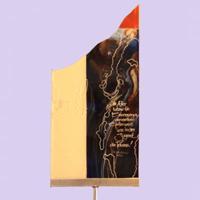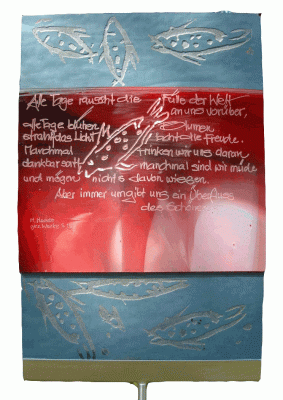 Collage. Meist beidseitige Bebilderung mit Texten aus Lyrik und Prosa. Edelstahlrahmung.