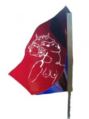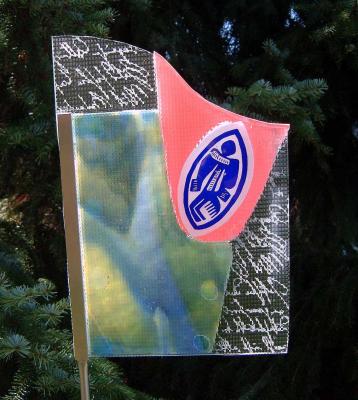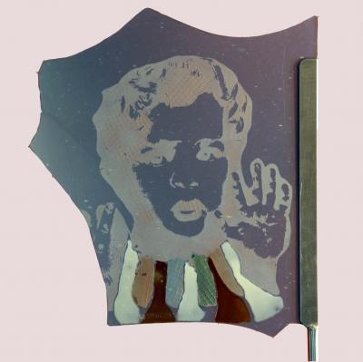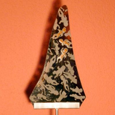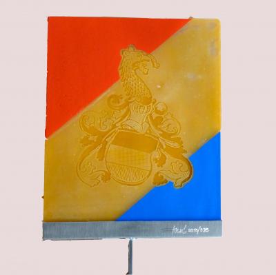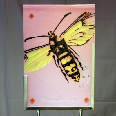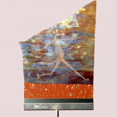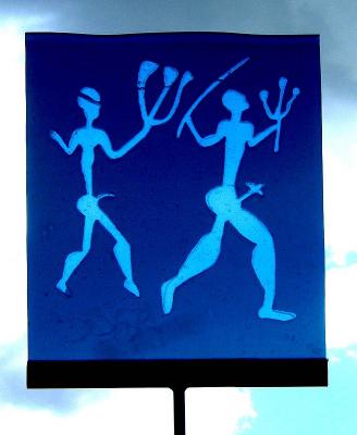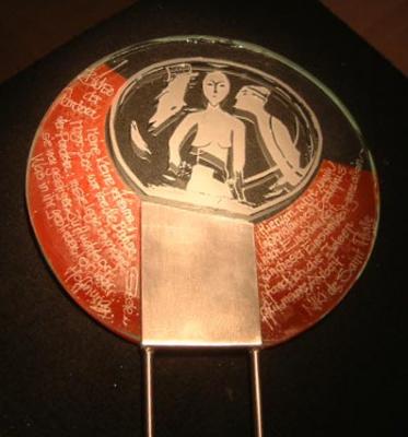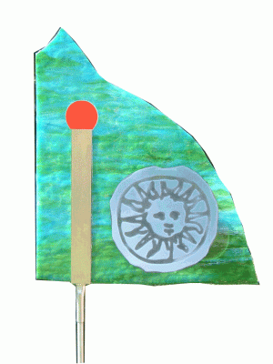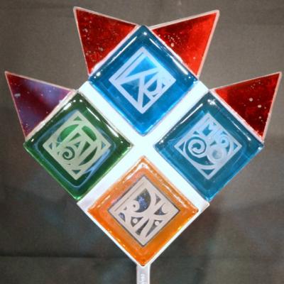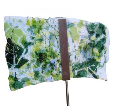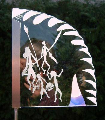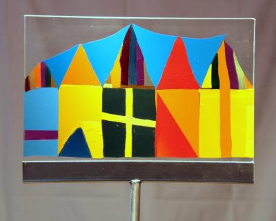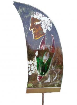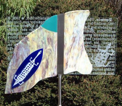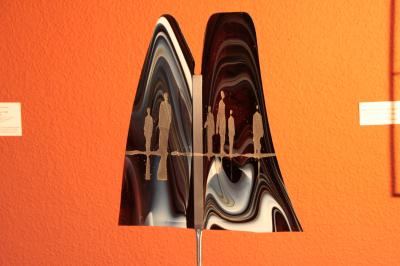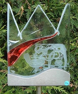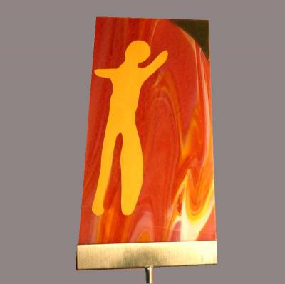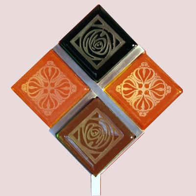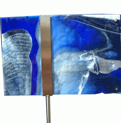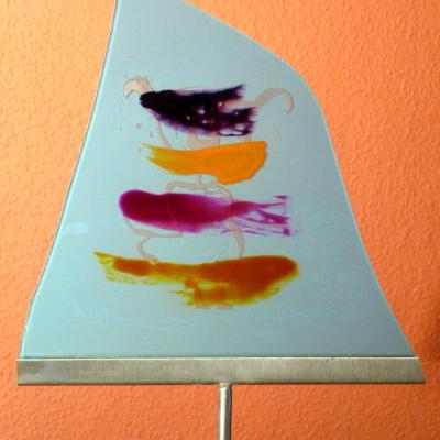 Das Bild: verschiedene Farbgläser auf Floutglasträgerscheibe: geätzte-gravierte-sandgestrahlte Überfanggläser als
