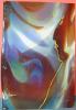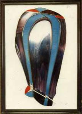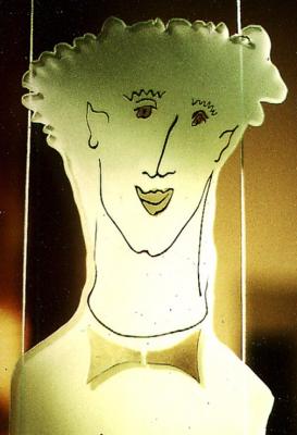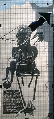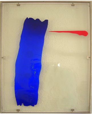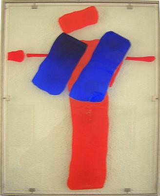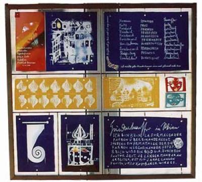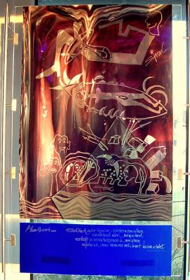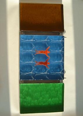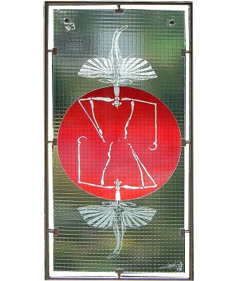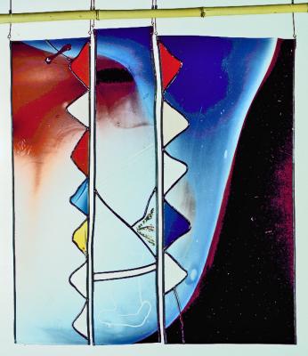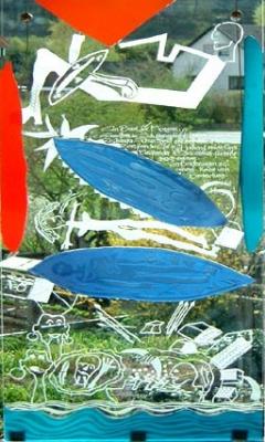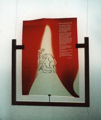 Bilder in farbigem Glas, hängend in einem Fenster als reines Durchlichtergebnis oder an einer farbigen Wand ruhend mit Themen erotischer Natur bis hin zu Prosa von Brecht und Hesse.
