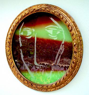 Unikate in Echtantikglas, bemalt, geätzt, graviert. Gerahmt mit poliertem Edelstahl.